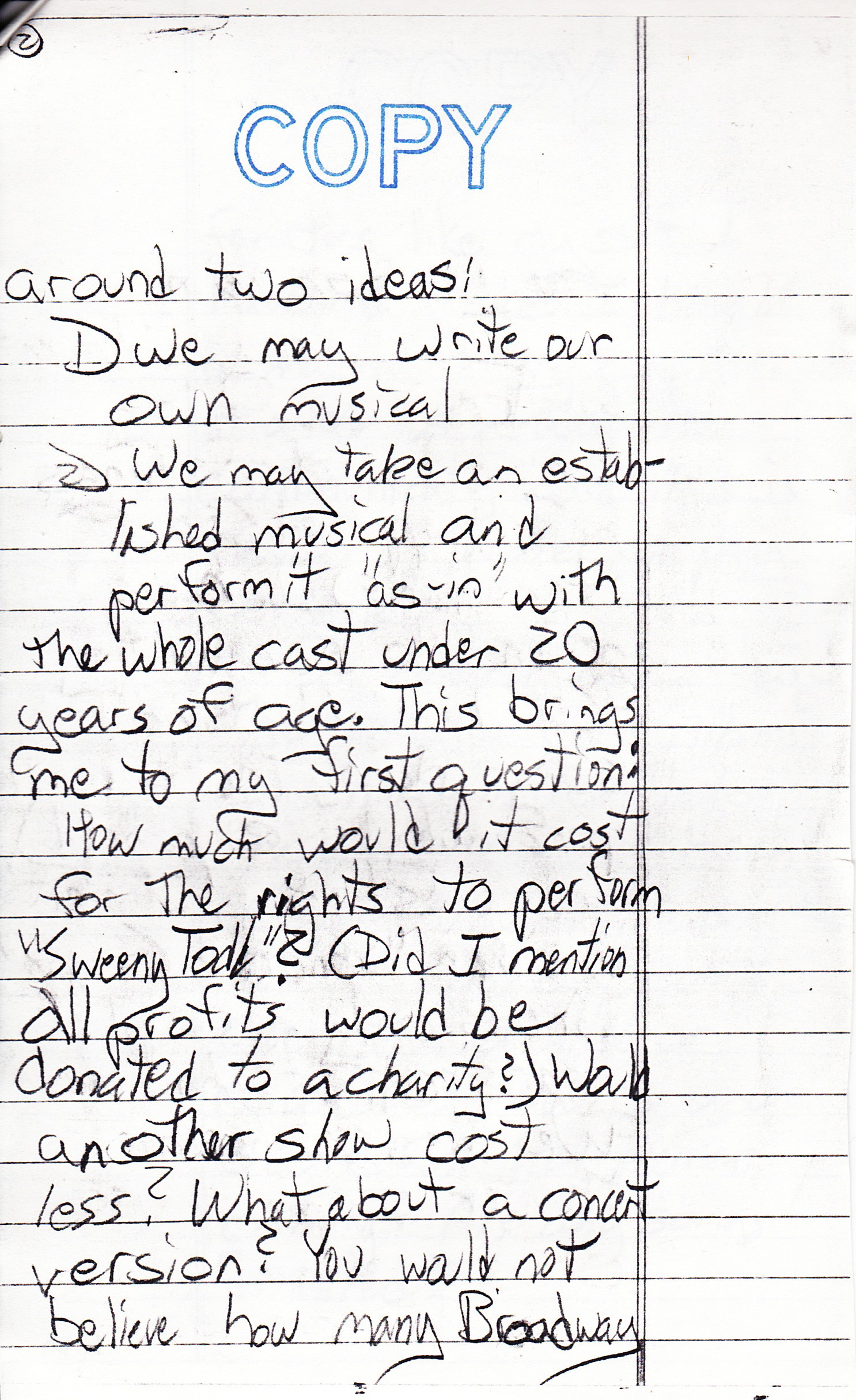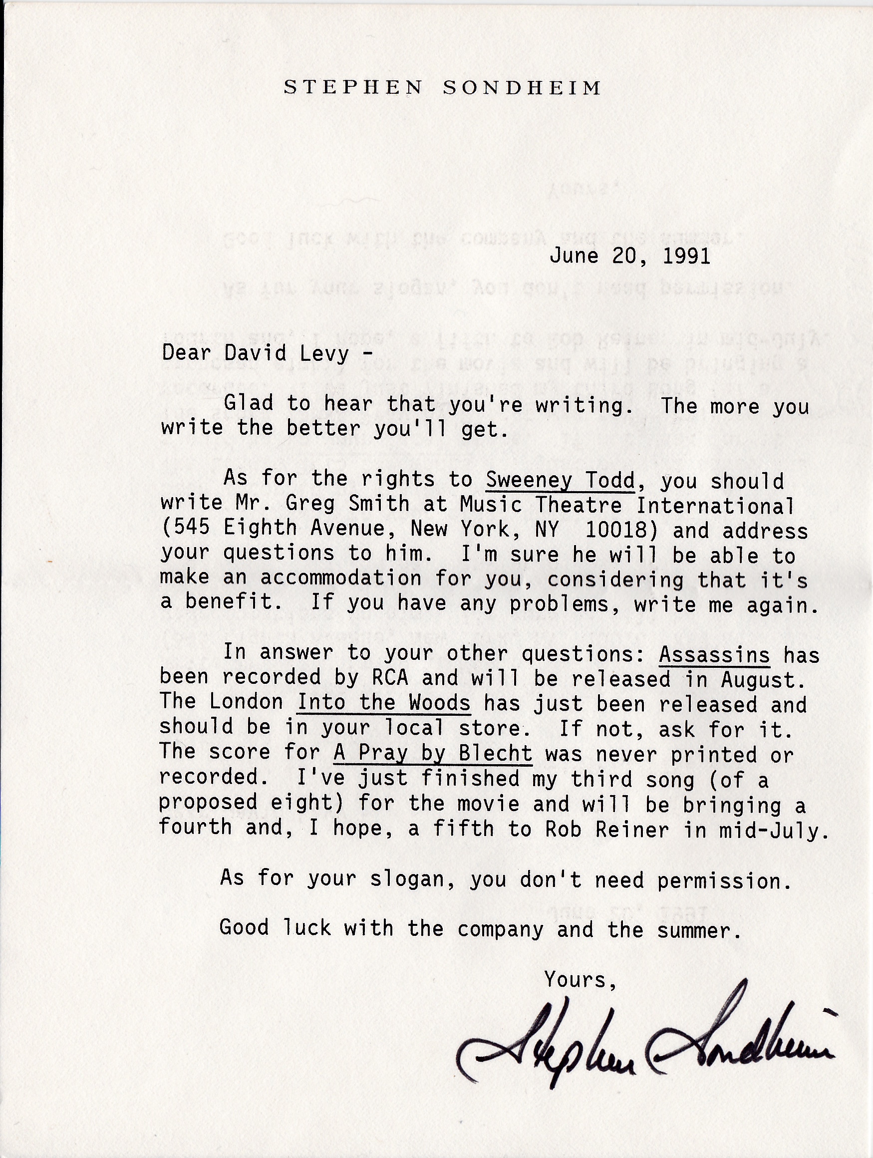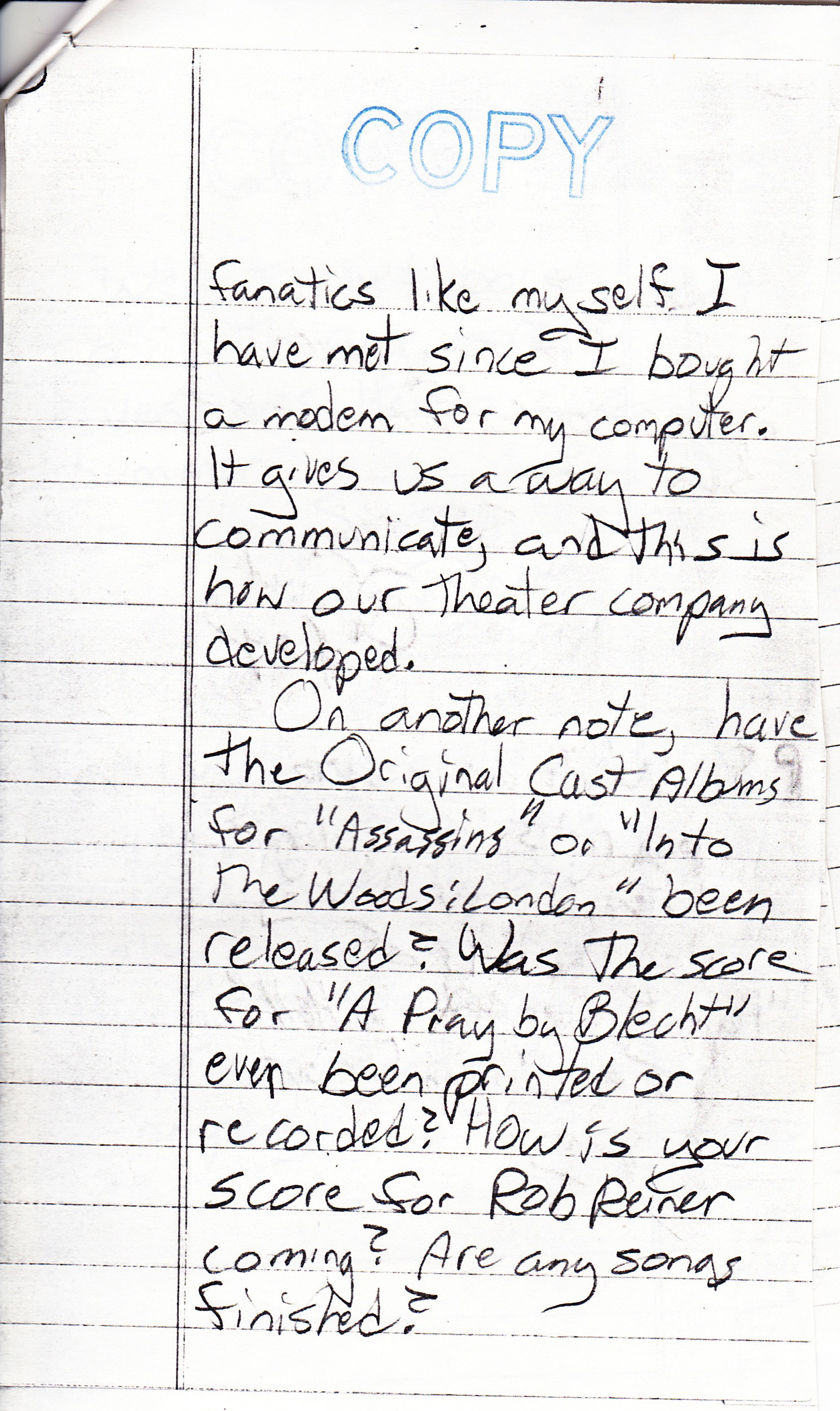When I was in the fifth grade, I found Stephen Sondheim’s home address in a reference book at the public library. This armed me with all I needed to begin a years-long correspondence with my hero. While I have kept most of his letters to me, I believe this is the only letter to him that survives. It was written when I was 13, several years into this project of mine.